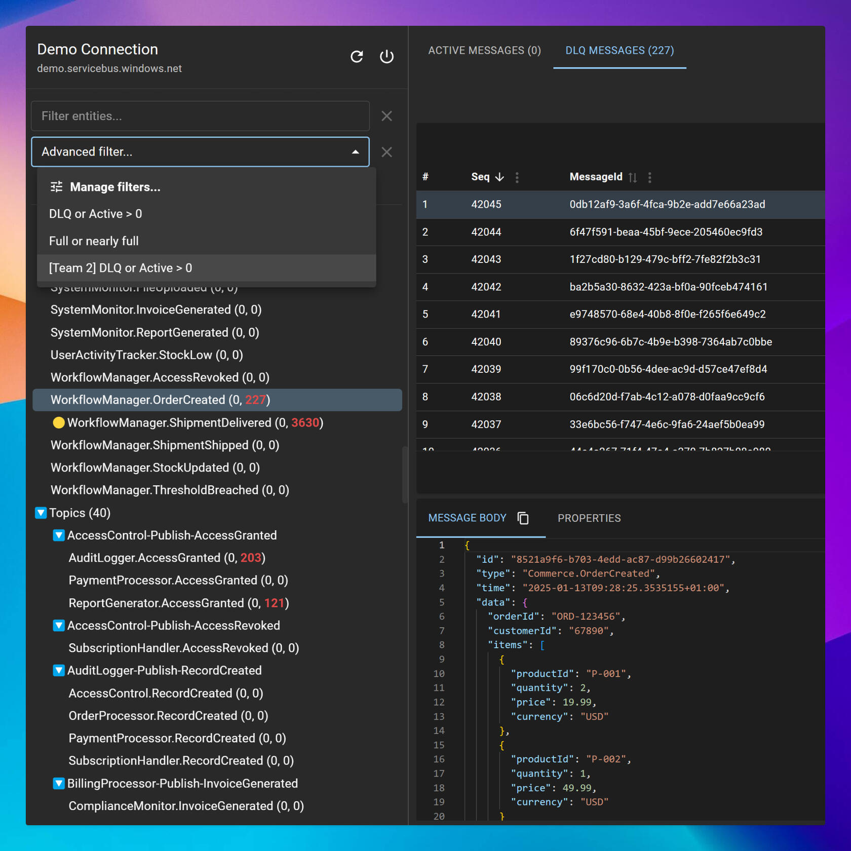 Easily investigate, send, reprocess, and delete messages, while efficiently managing your queues, topics, and subscriptions.